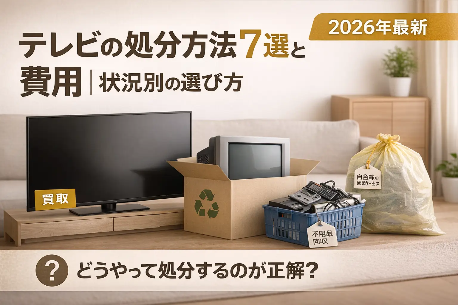 テレビは家電リサイクル法の対象製品のため、粗大ゴミとして処分できません。この記事では、テレビの正しい処分方法7つと費用の目安、無料で処分する方法、ブラウン管・液晶・有機ELなど種類別の注意点まで、2026年最新の情報をもとに解説します。