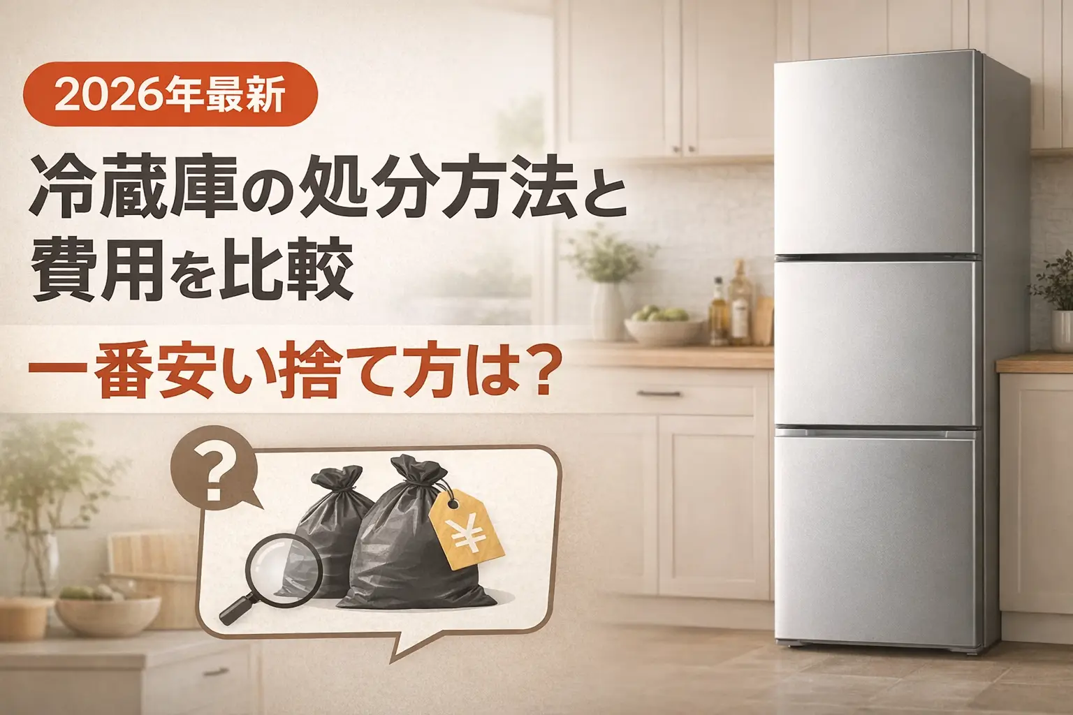 冷蔵庫は家電リサイクル法の対象で、処分にはリサイクル料金(3,740〜4,730円程度)+収集運搬料金(1,000〜3,000円程度)がかかります。新しい冷蔵庫の購入時に販売店で引き取ってもらうのが最もスムーズです。下取りキャンペーンを実施している量販店もあるため、購入時に確認しましょう。