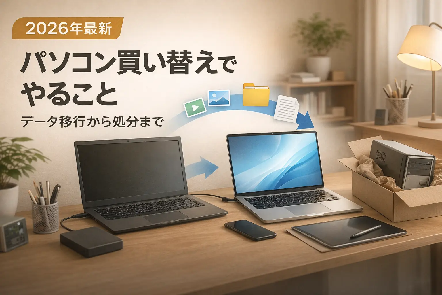 パソコンの買い替えを検討しているけれど、「いつ買い替えるべき?」「データ移行はどうする?」「古いPCの処分は?」と疑問が尽きない方も多いはず。この記事では、買い替え時期の判断基準から事前準備、データ移行、初期設定、古いパソコンの処分方法まで、買い替えの全プロセスをステップごとに解説します。