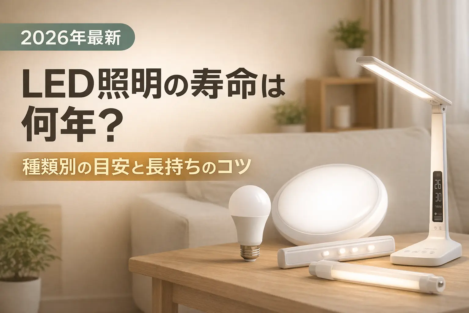 LED照明の寿命は約40,000時間で、1日10時間の使用で約10年もつとされています。しかし「本当に10年もつの?」と疑問に思う方も多いのではないでしょうか。この記事では、LED電球・LED蛍光灯・LEDシーリングライトの種類別の寿命から、白熱電球や蛍光灯との比較、寿命が短くなる原因と長持ちさせるコツまで、LED照明の寿命に関する疑問をまとめて解説します。