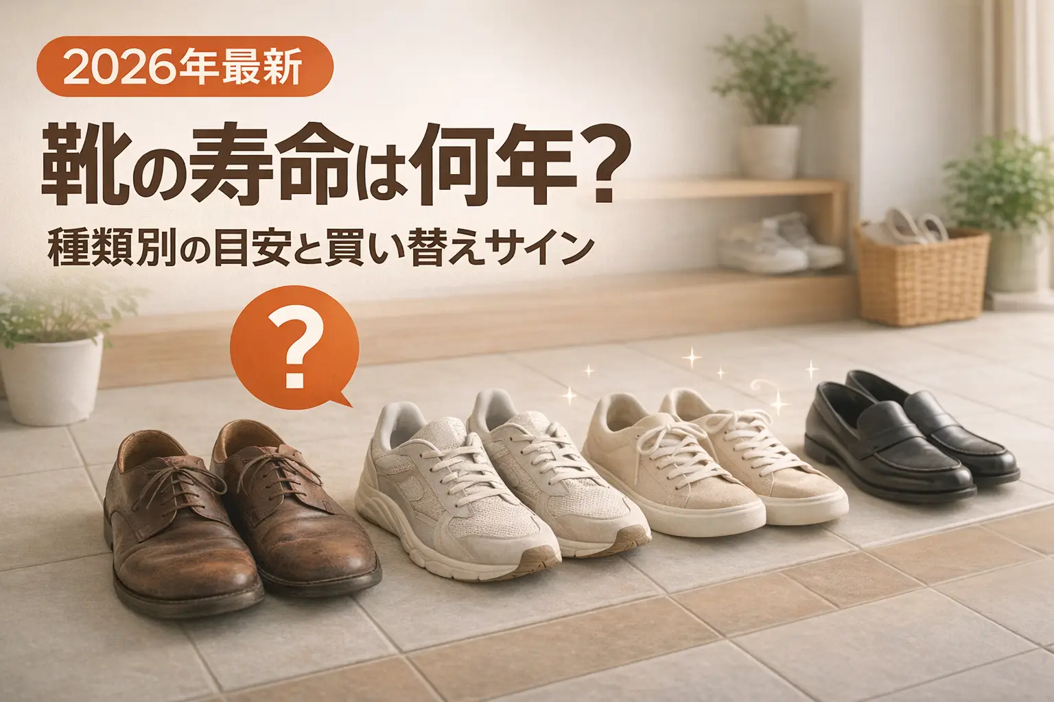 靴の寿命を左右する最大の要因は「靴の種類(素材・製法)」と「履く頻度」の2つです。毎日同じ靴を履くと寿命は半分以下になることも珍しくありません。下の一覧表で自分の靴の寿命目安を確認し、買い替えサインが出ていないかチェックしてみてください。