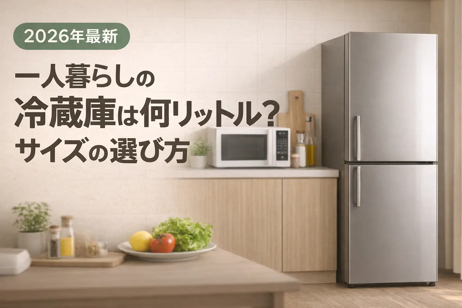 一人暮らしの冷蔵庫選びで最も悩むのが「サイズ(容量)」。小さすぎると食材が入りきらず、大きすぎるとスペースも電気代ももったいない。この記事では、自炊頻度別の最適な容量目安から、物理的な外寸サイズ、設置スペースの測り方、そしておすすめの冷蔵庫まで、一人暮らしの冷蔵庫選びに必要な情報をまとめました。