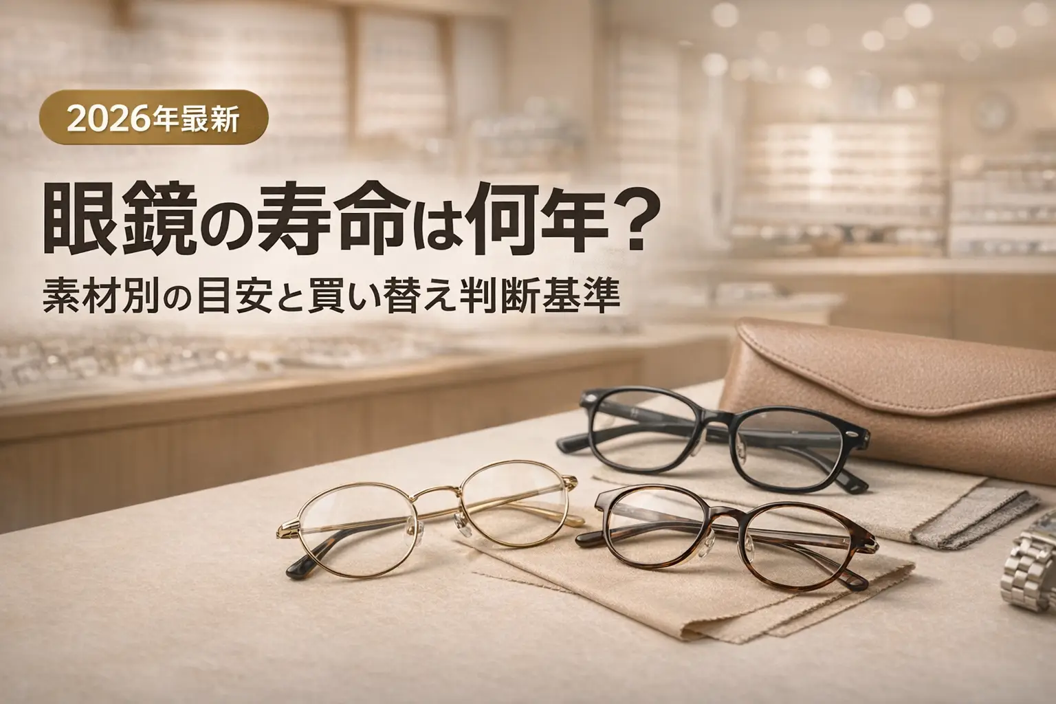 - メガネ全体の寿命は2〜3年が目安。レンズ約2〜4年、フレーム約2〜10年以上(素材による)