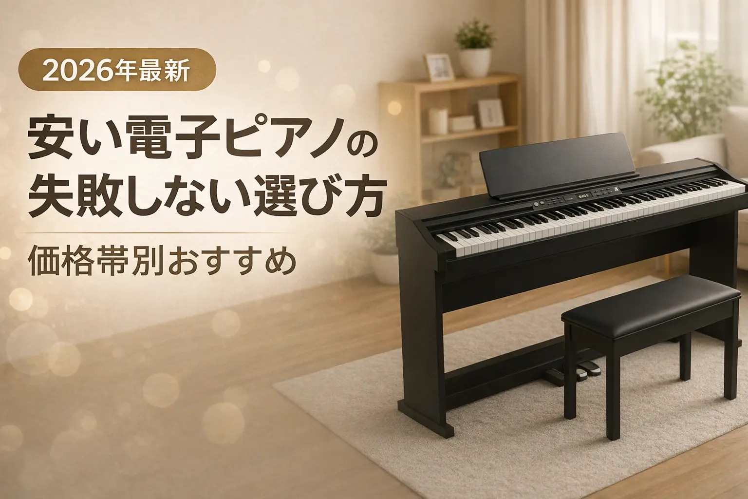 「電子ピアノが欲しいけれど、できるだけ安く買いたい」「安い電子ピアノで失敗したくない」という方に向けて、失敗しない選び方のポイントと、価格帯別のおすすめモデルを紹介します。予算1万円台から10万円以下まで、初心者が本当に買うべき電子ピアノがわかります。