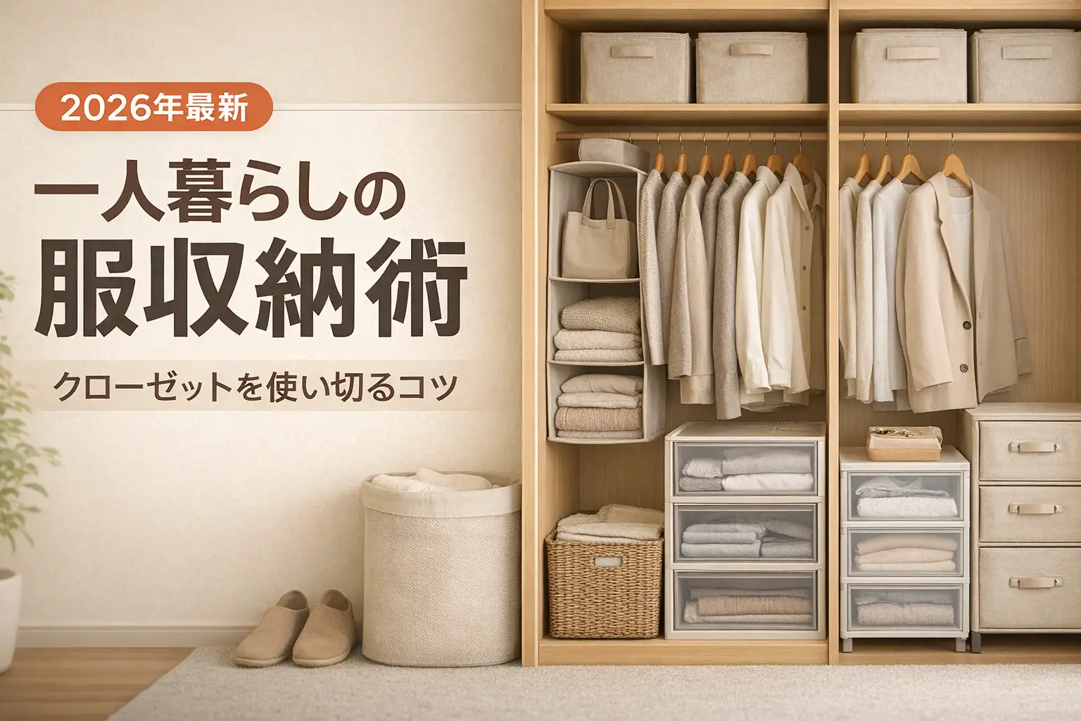 まず着ない服を手放して量を減らし、次にクローゼットを上段・中段・下段に分けて使い、最後に衣装ケースや薄型ハンガーなどのグッズで収納量を最大化するのが基本です。クローゼットが小さい・ないという場合は、ハンガーラックやベッド下収納を組み合わせれば十分対応できます。