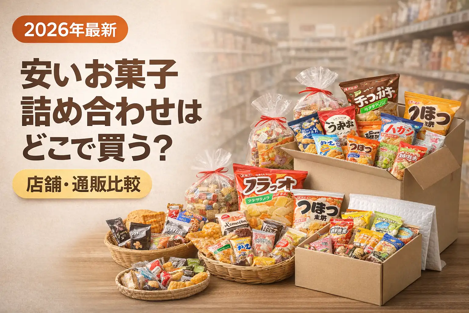 「お菓子の詰め合わせをなるべく安く買いたい」——バラまき用、家族用、職場への挨拶菓子、シーンは違っても悩みは同じです。この記事では、実店舗・通販・訳ありそれぞれの購入ルートを比較しながら、目的に合った最安ルートを具体的に解説します。