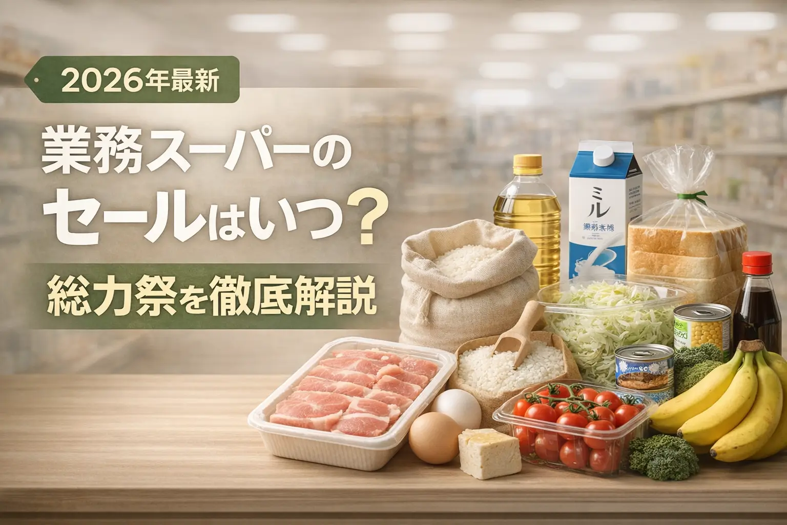 業務スーパーで一番お得なタイミングは年2回開催の「総力祭」。2026年春は3月1日〜4月30日が開催期間です(第1弾3月・第2弾4月)。毎月の「月間特売」も活用すれば、1年を通じてお得に買い物ができます。