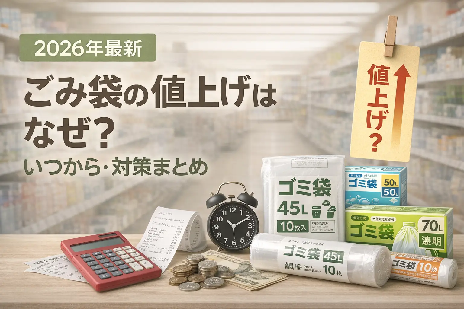 最近、自治体からの「指定ごみ袋の価格を改定します」というお知らせを受け取った方も多いのではないでしょうか。スーパーで売っている市販のポリ袋も、気づけばじわじわ値上がりしています。「なぜ値上がりするの?」「いつから?」「家計にどれくらい影響する?」——この記事では、ごみ袋値上げの理由から自治体別の事例、家計への影響試算、節約対策まで、2026年3月時点の最新情報をもとにわかりやすく解説します。