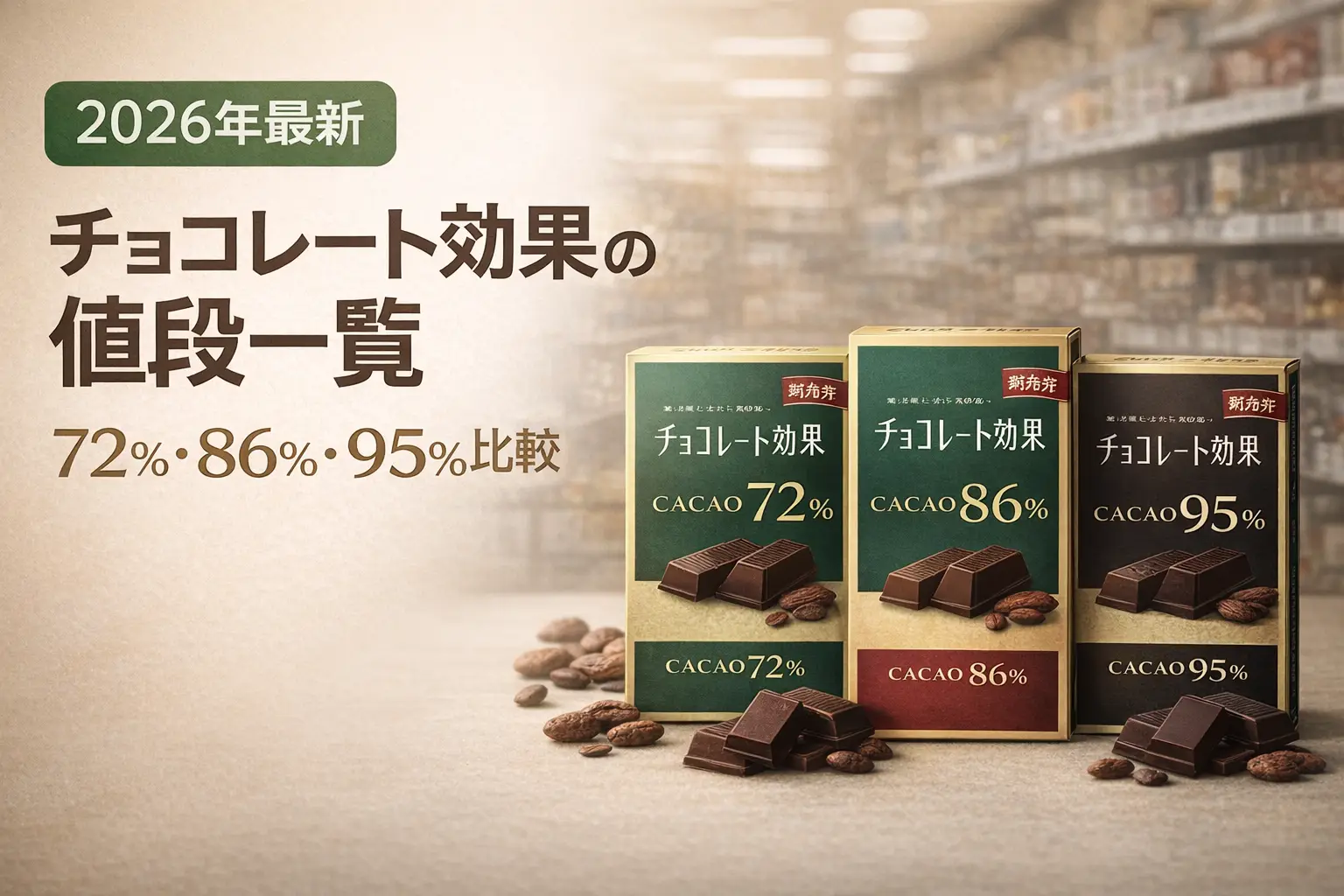 「チョコレート効果ってどこで買うと一番安いの?」「72%・86%・95%で値段はどう違う?」気になりますよね。この記事では、スーパー・コンビニ・Amazon・ドン・キホーテ・コストコそれぞれの価格を比較し、グラム単価で見た最もお得な買い方まで徹底解説します。