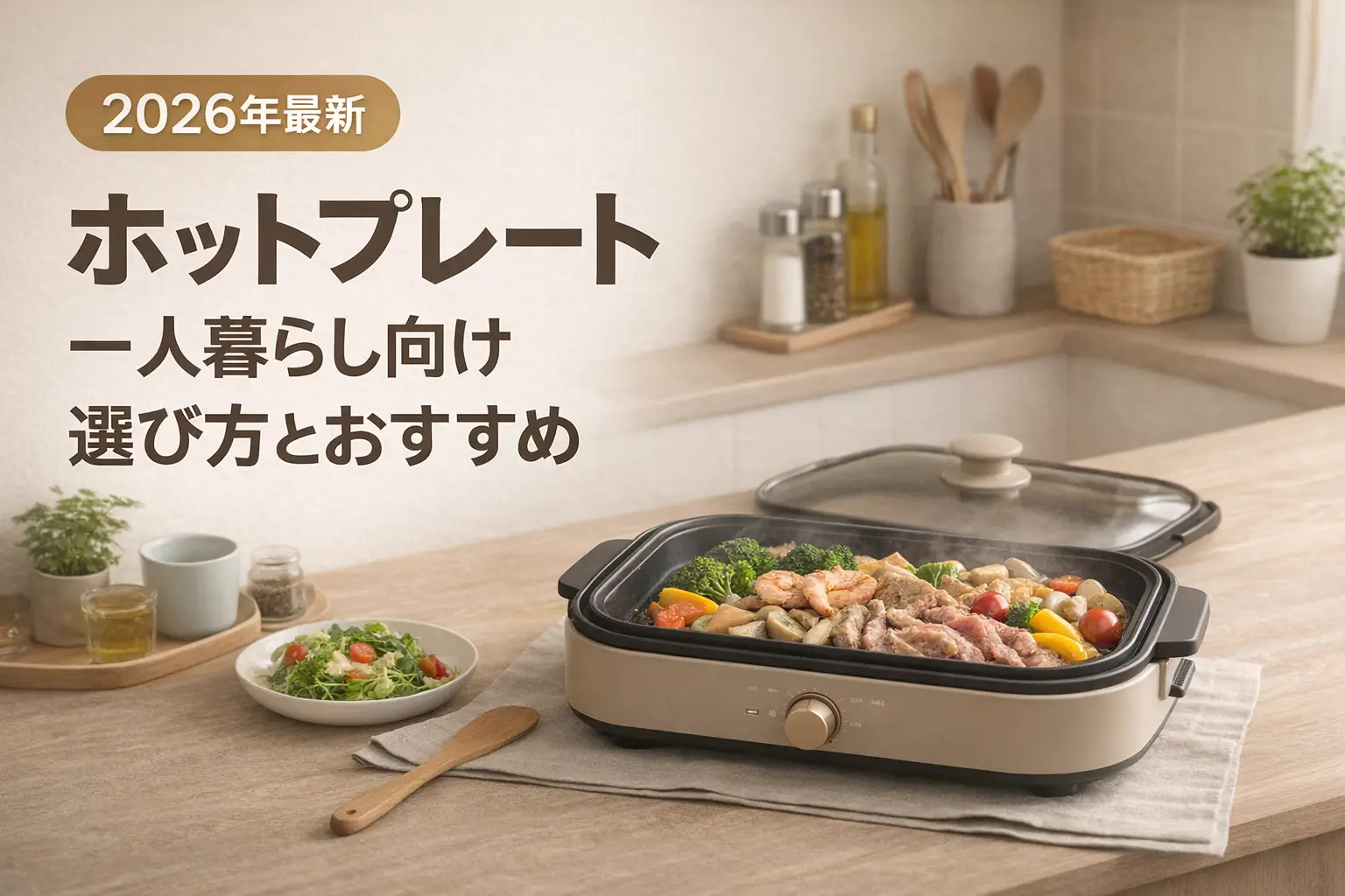 ホットプレートを選ぶときは、サイズ・プレートの種類・機能・デザインの4つのポイントを確認するのがおすすめです。一人暮らしの場合は特に「コンパクトさ」と「収納のしやすさ」が重要になりますよ。