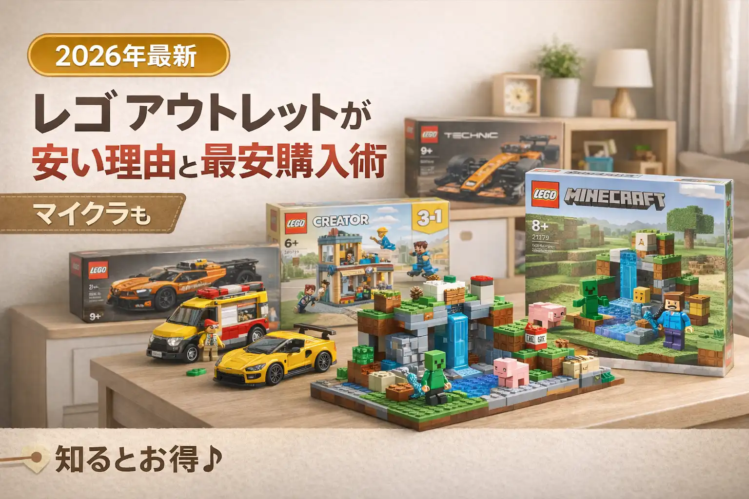 「アウトレットのレゴストアって安いの?」と気になっている方は多いのではないでしょうか。結論からお伝えすると、アウトレット実店舗では大手おもちゃ店より安い傾向があり、「特別価格」表示の商品なら最大40%オフになることもあります。ただし、すべての商品がお得とは限りません。このページでは、アウトレット・Amazon・楽天などの購入先ごとに価格の特徴を徹底比較し、マイクラレゴ(レゴ マインクラフト)を安く買う方法まで詳しく解説します。