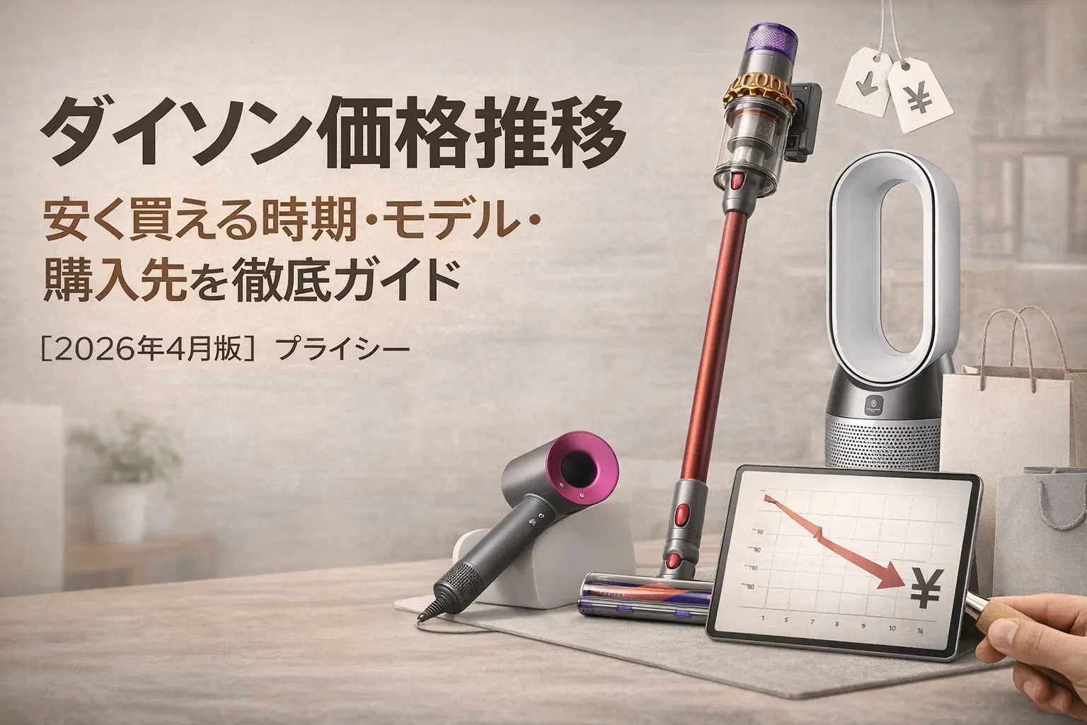 ダイソンの掃除機を買いたいけれど、「今が買い時なのか」「もう少し待てば安くなるのでは」と迷う方は多いのではないでしょうか。ダイソンは年間を通じて価格が動く家電の代表格で、大型セールや新モデル発売のタイミング次第で支払う金額に数万円単位の差が出ることも珍しくありません。この記事ではダイソン掃除機の価格推移の基本パターンと、安く買うためのタイミング・モデル・購入先の選び方を、プライシー編集部が整理してお伝えします。