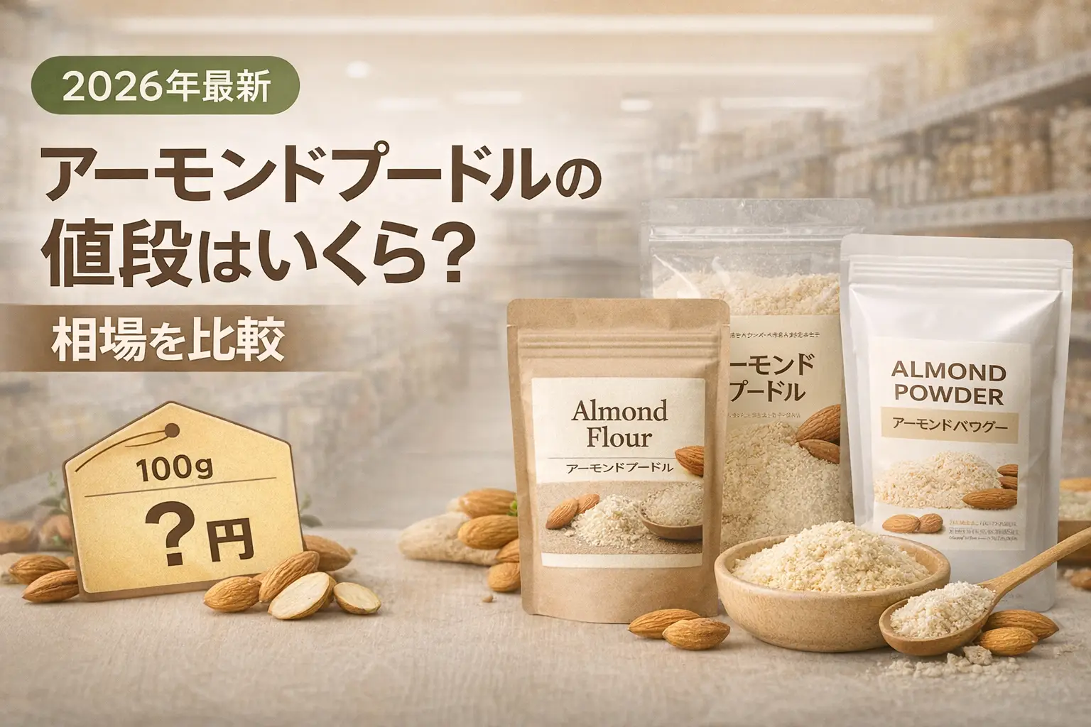 アーモンドプードルはお菓子作りの定番材料ですが、「どこで買えばいくらするの?」と値段が気になっている方も多いのではないでしょうか。スーパー・業務スーパー・カルディ・100均・通販とさまざまな購入場所があり、同じ素材でも価格がかなり異なります。この記事では、2026年4月現在の最新価格相場と、購入場所別の100gあたり単価をわかりやすく比較してご紹介します。