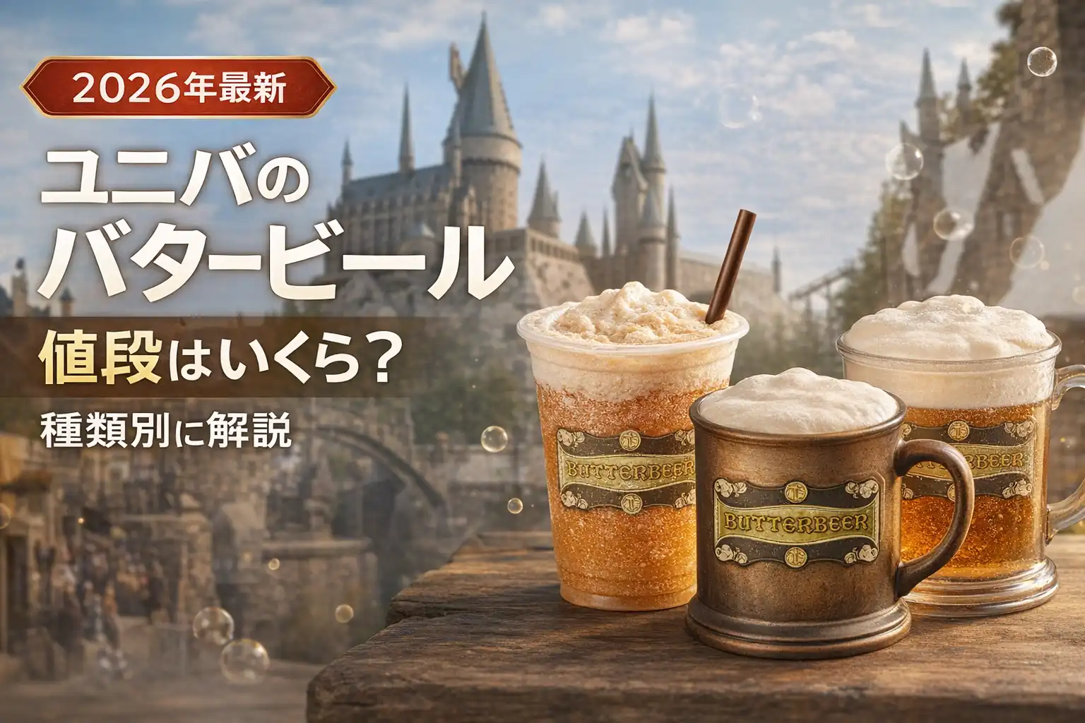 USJのバタービールは通常のバタービールが700円(プラカップ)から。種類は全4種類あり、フローズンやホットは850円です。マグカップ付きにすると持ち帰りできる記念品としても使えます。すべてノンアルコールで、子どもから大人まで楽しめます。2026年4月1日〜5月17日は「バタービール・シーズン」が開催中で、シュークリームなど限定メニューも登場しています。