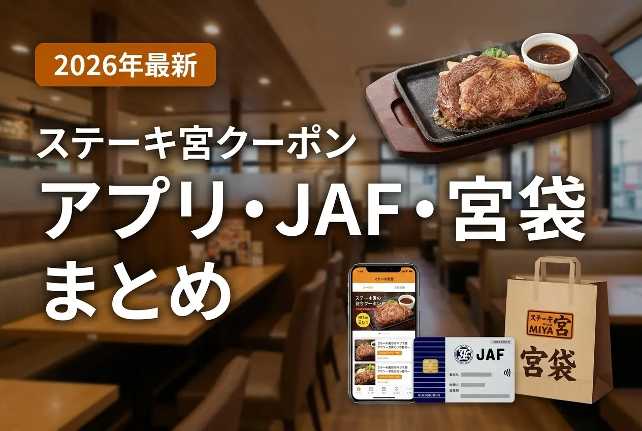 「ステーキ宮でお得に食事したい」「クーポンってどこで手に入るの?」と思っていませんか?ステーキ宮には公式アプリ・JAF・子育て支援パスポート・宮袋など複数のクーポン・割引があります。この記事では2026年4月時点で実際に使えるクーポンを一覧でまとめ、それぞれの入手方法と使い方をわかりやすく解説します。