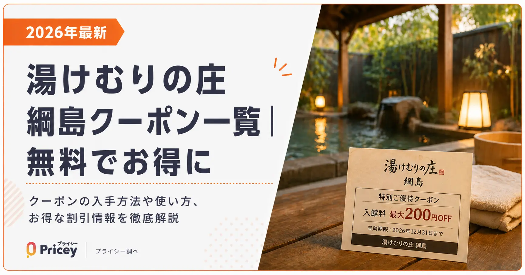 神奈川・横浜の日帰り温泉「綱島源泉 湯けむりの庄」を少しでも安く楽しみたい方へ。この記事では、2026年4月時点で使えるクーポン・割引の全種類と入手方法をまとめました。無料で使えるものから月額サービスまで、自分に合った方法でお得に利用しましょう。